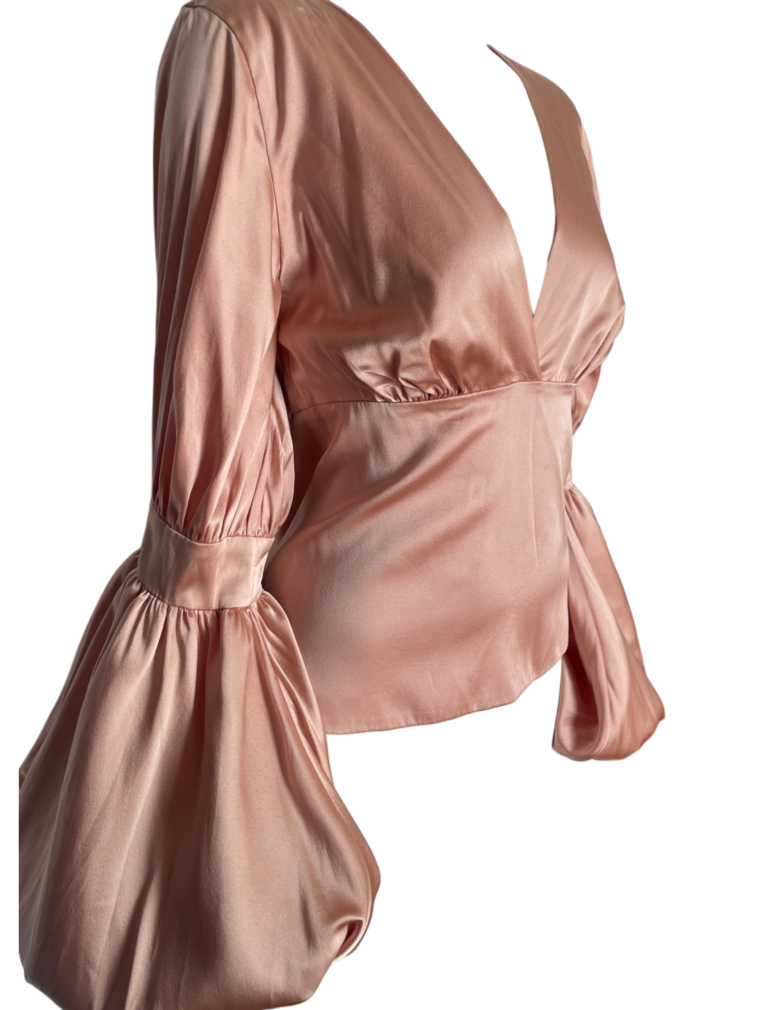Esta blusa en seda destaca por su elegante escote en V que realza la feminidad. Las mangas largas con detalle globo en la muñeca aportan un toque sofisticado y moderno, ideal para ocasiones especiales o para elevar tu look diario con un estilo refinado y cómodo.