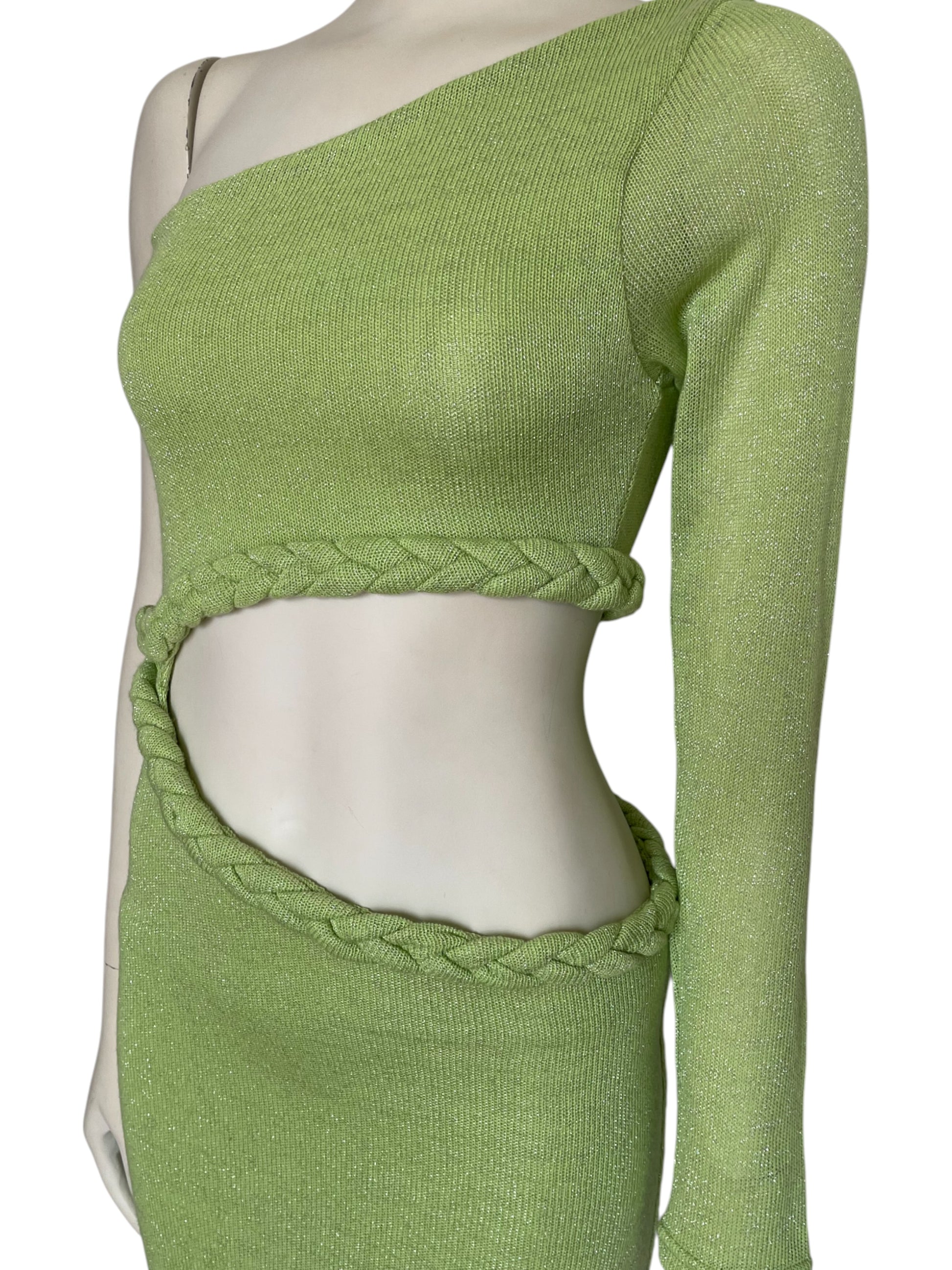 Este vestido maxi verde combina elegancia y estilo con su diseño tejido y corte medio hombro. Destaca por su detalle lateral con cut out y delicadas trenzas que aportan un toque único y sofisticado. La manga larga le brinda un acabado refinado, ideal para cualquier ocasión especial.