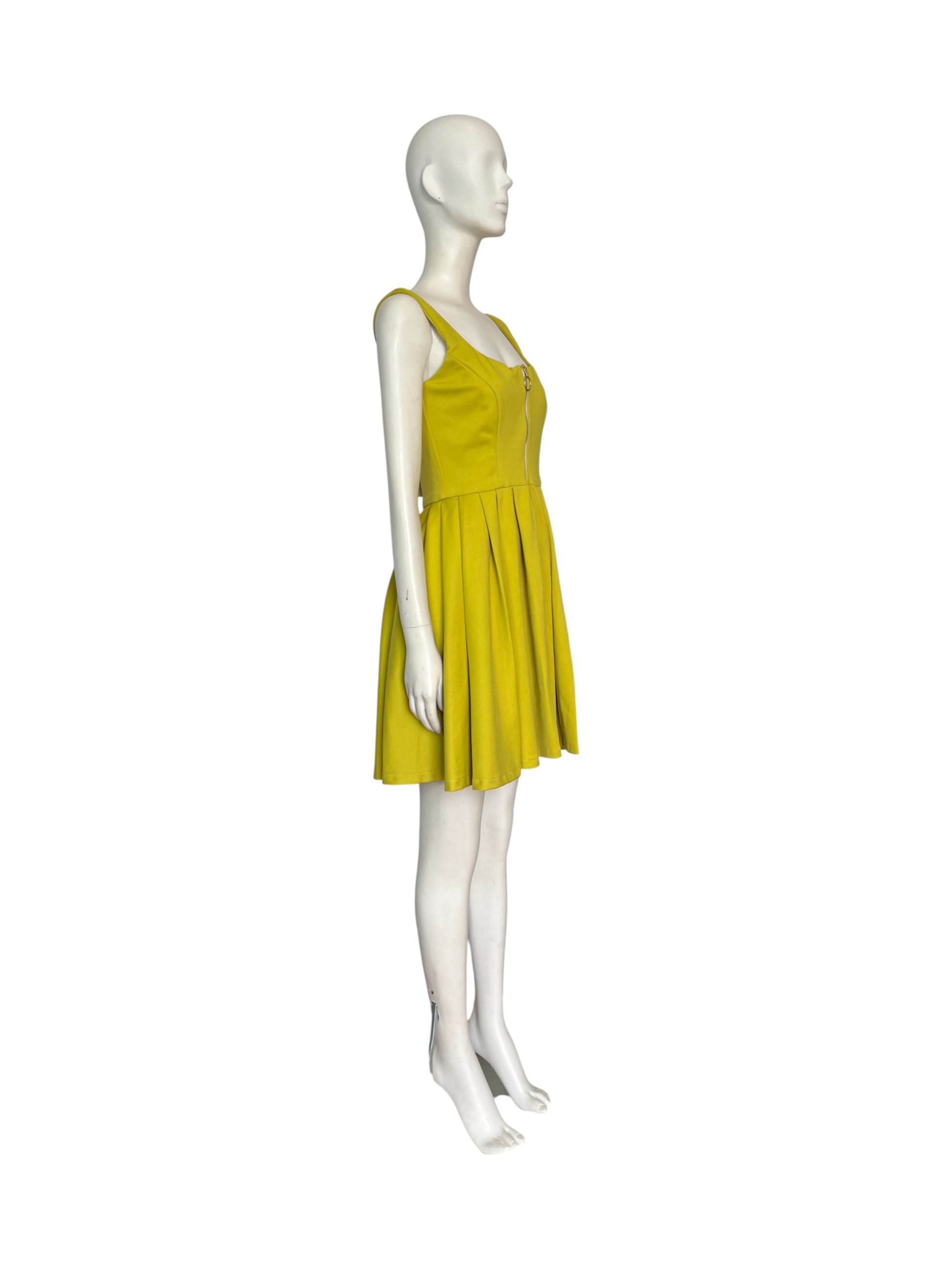 Este vestido mini verde destaca por su diseño moderno y femenino, con una cremallera frontal que añade un toque contemporáneo y facilita su uso. Los pequeños pliegues en la falda aportan movimiento y elegancia, perfectos para cualquier ocasión. Ideal para quienes buscan un estilo fresco y sofisticado en una sola prenda.