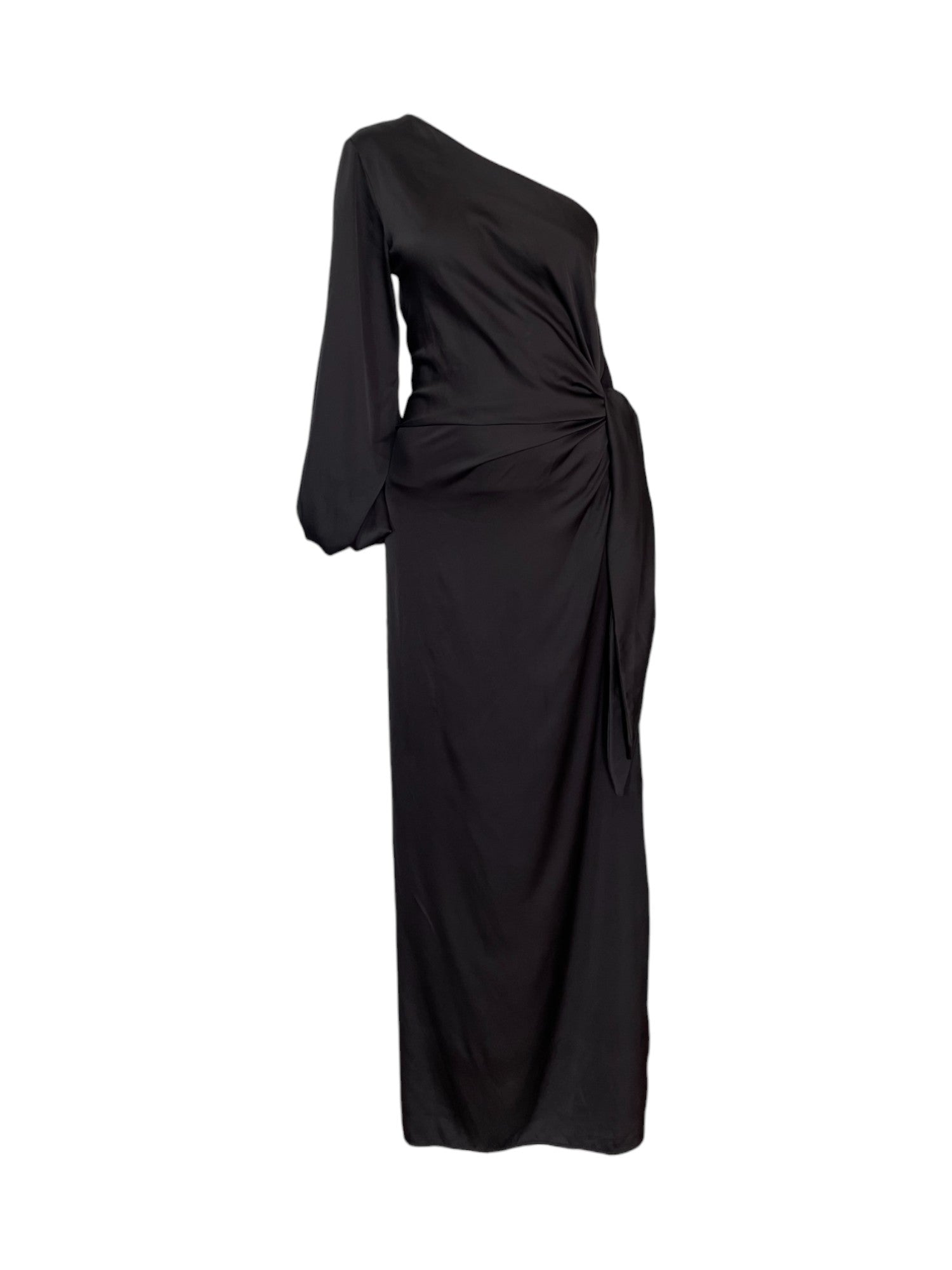 Este vestido maxi negro combina elegancia y sofisticación con su diseño de seda suave y manga larga tipo globo. Su escote medio hombro resalta la silueta, mientras que el detalle de nudo aporta un toque distintivo. La abertura media pierna lateral añade movilidad y un aire sensual, ideal para ocasiones especiales donde se requiere estilo y comodidad.