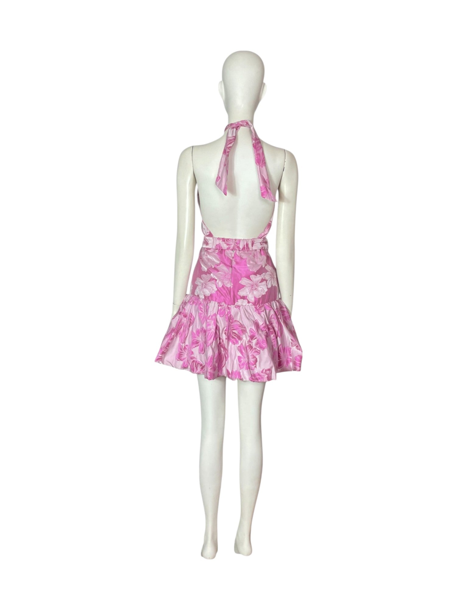 Este vestido mini en tono rosa destaca por su cierre con cremallera invisible que garantiza un acabado limpio y elegante. Su escote en la espalda aporta un toque sofisticado y femenino, mientras que el amarre en el cuello y el cinturón permiten ajustar la prenda para un fit personalizado y favorecedor.