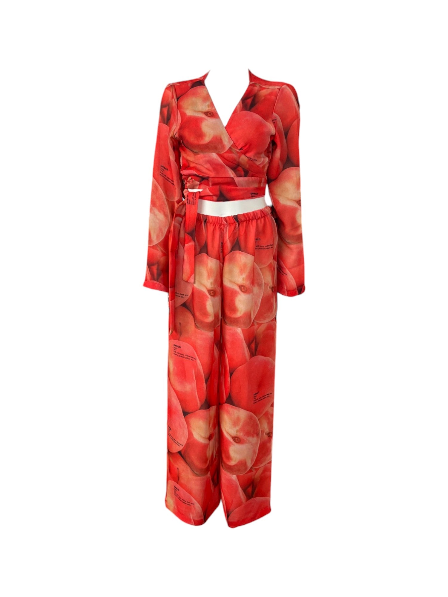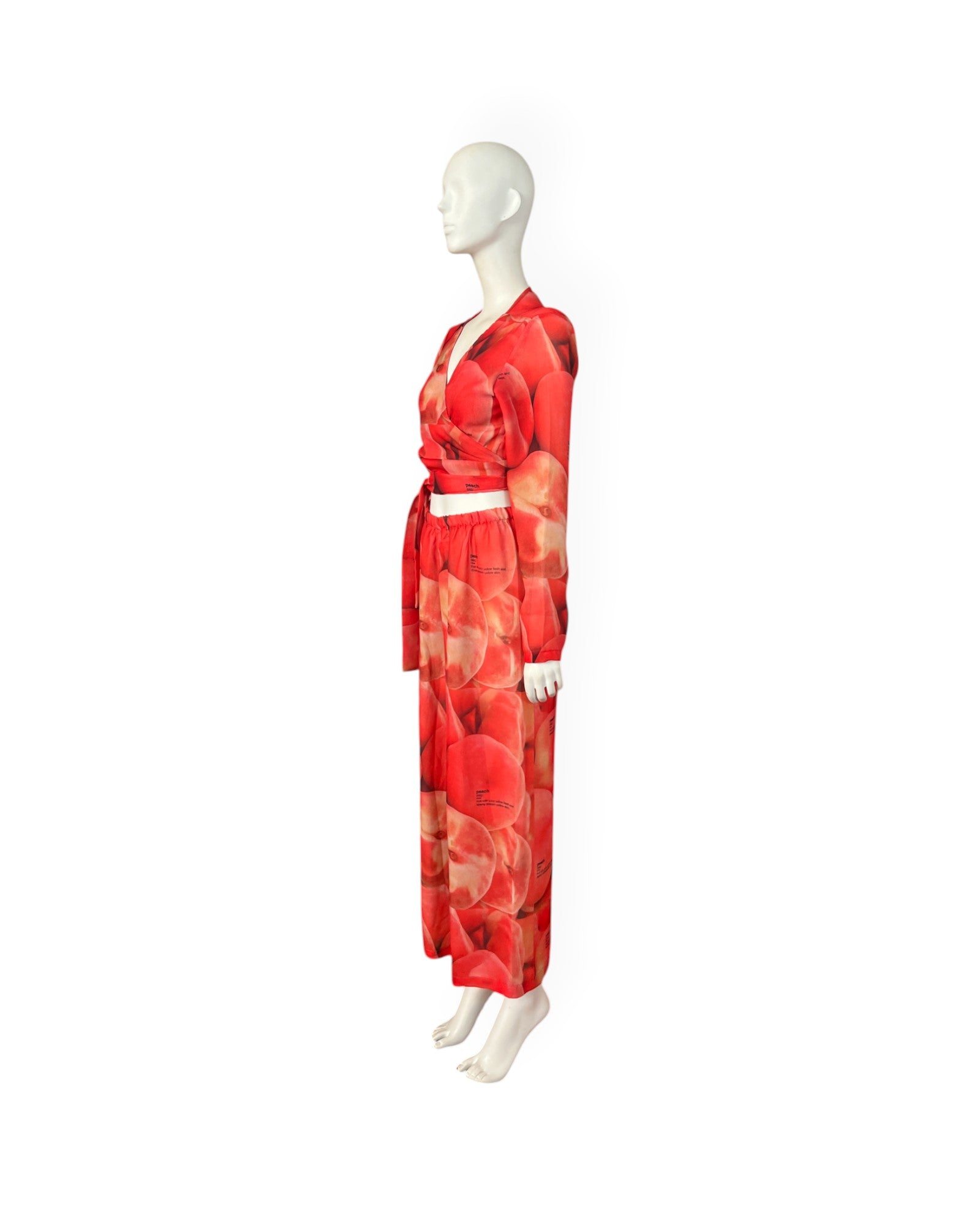 Este set de seda, compuesto por un top ajustable con amarres en el busto y mangas largas, combinado con un pantalón elegante, ofrece una opción sofisticada y cómoda para cualquier ocasión especial. La suavidad de la seda proporciona una sensación lujosa, mientras que el diseño cuidadoso realza la figura con un toque moderno y femenino. Ideal para quienes buscan estilo y comodidad en una sola prenda.