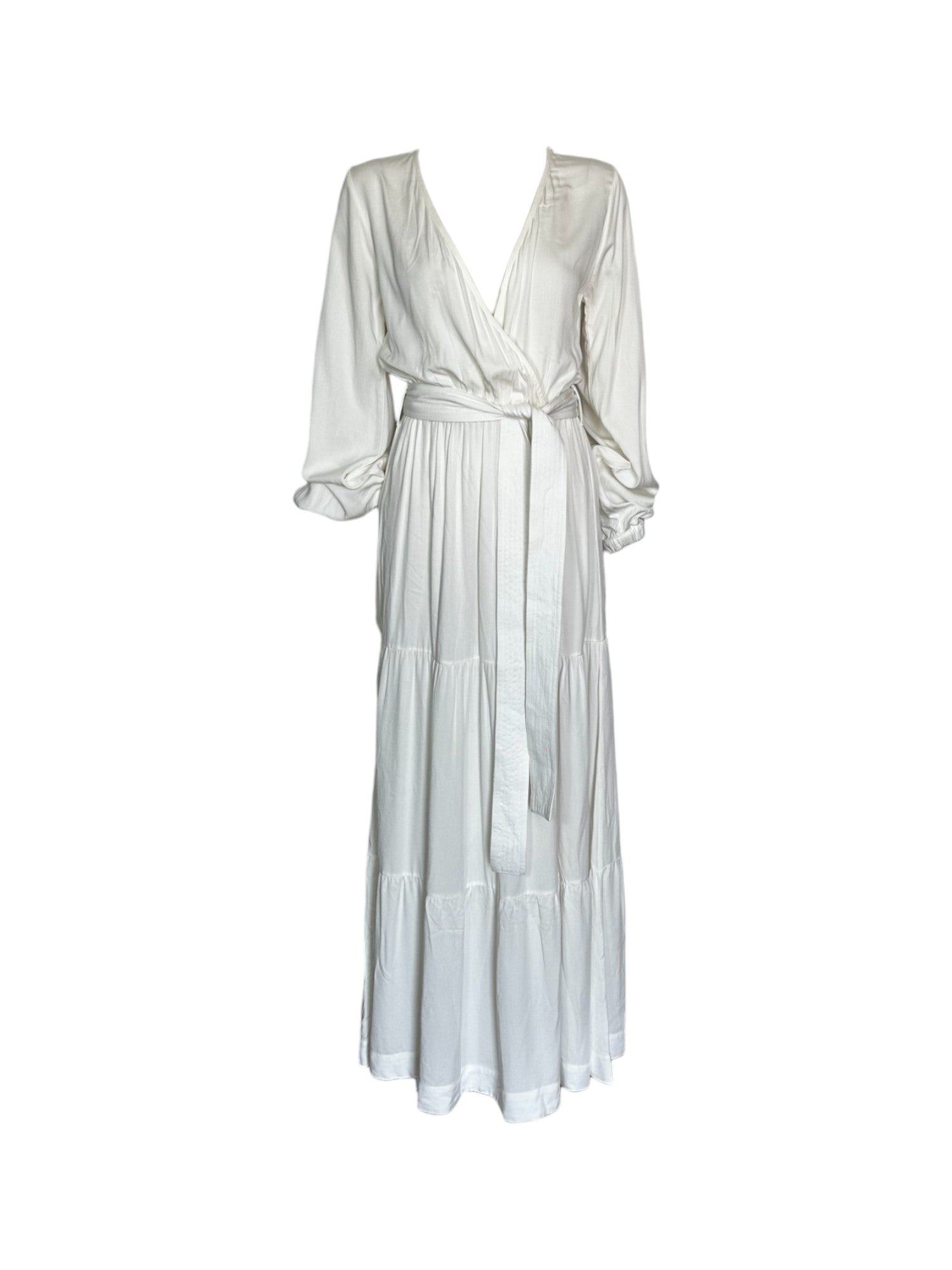 Descubre la elegancia del vestido maxi Arnica, diseñado en blanco puro para destacar tu estilo con sofisticación. Su cinturón ajustable realza la cintura, mientras el escote en V cruzado aporta un toque femenino y sensual. Las mangas largas proporcionan comodidad y versatilidad, y el amplio ruedo crea un movimiento fluido y glamoroso. Perfecto para cualquier ocasión donde quieras lucir fresca y chic.