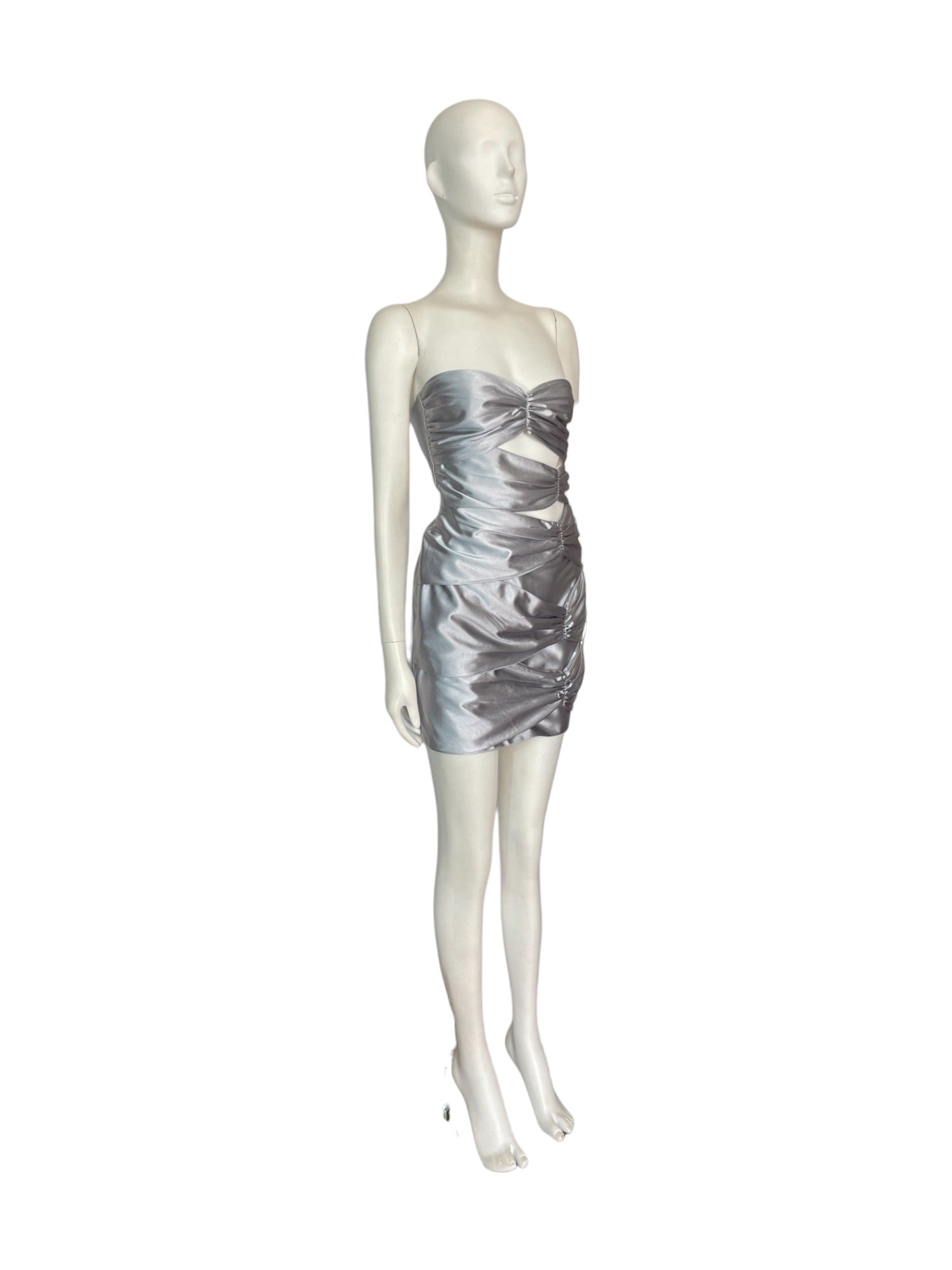 Este mini vestido plateado con efecto metalizado destaca por su diseño moderno y sofisticado. Su escote delantero tipo nudo añade un toque de detalle elegante y favorecedor, realzando la figura femenina. Perfecto para eventos especiales o salidas nocturnas, su acabado brillante ofrece un look llamativo sin perder la clase. Su tejido ligero asegura comodidad, mientras que el corte mini aporta un estilo juvenil y atrevido. Ideal para quienes buscan una prenda que combine tendencia y elegancia