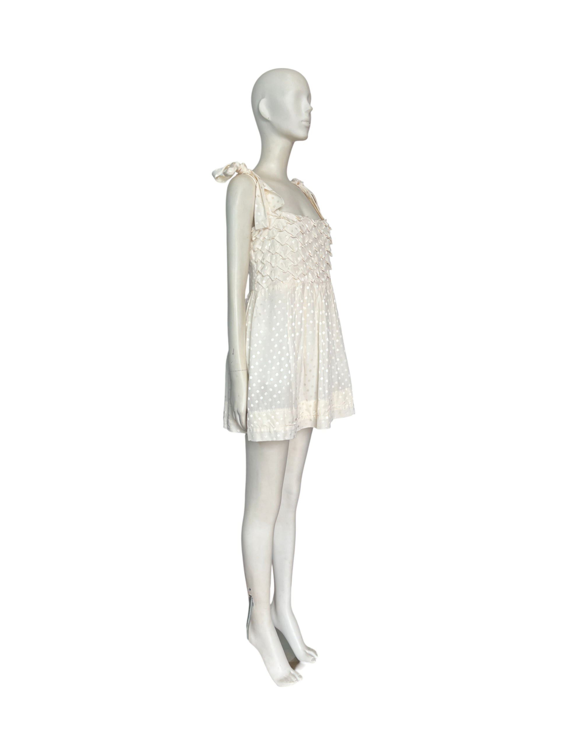 Este mini dress de puntos blancos combina elegancia y frescura con su diseño distintivo en el busto, característico de la marca. Las tiras ajustables garantizan un ajuste perfecto y cómodo, resaltando tu figura con estilo. Ideal para cualquier ocasión en la que quieras destacar con un toque clásico y femenino.