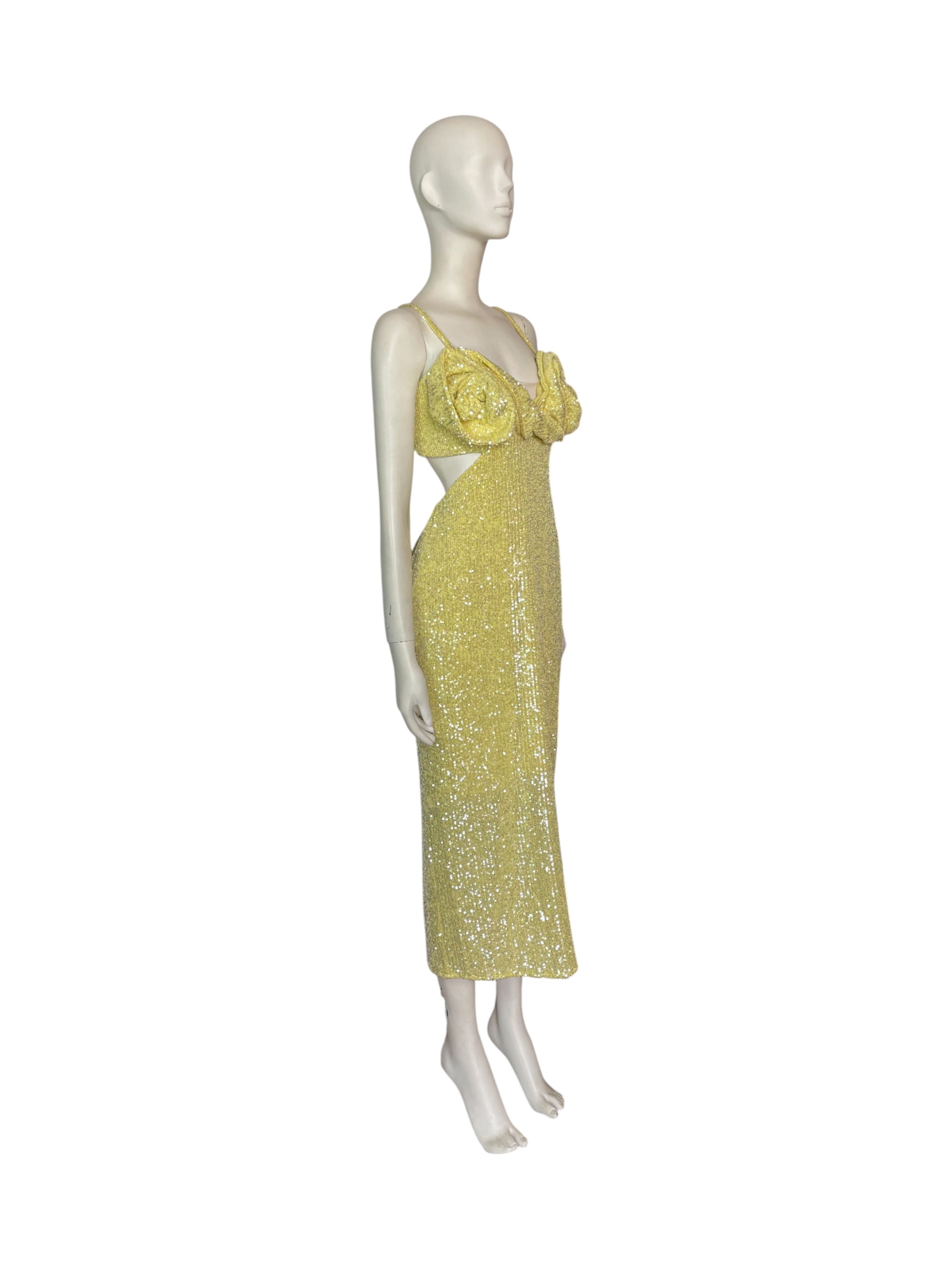 Vestido midi confeccionado con lentejuelas que capturan la luz en cada movimiento, creando un efecto visual cautivador. Diseñado con un escote elegante y tiras delgadas que proporcionan comodidad y un ajuste refinado.