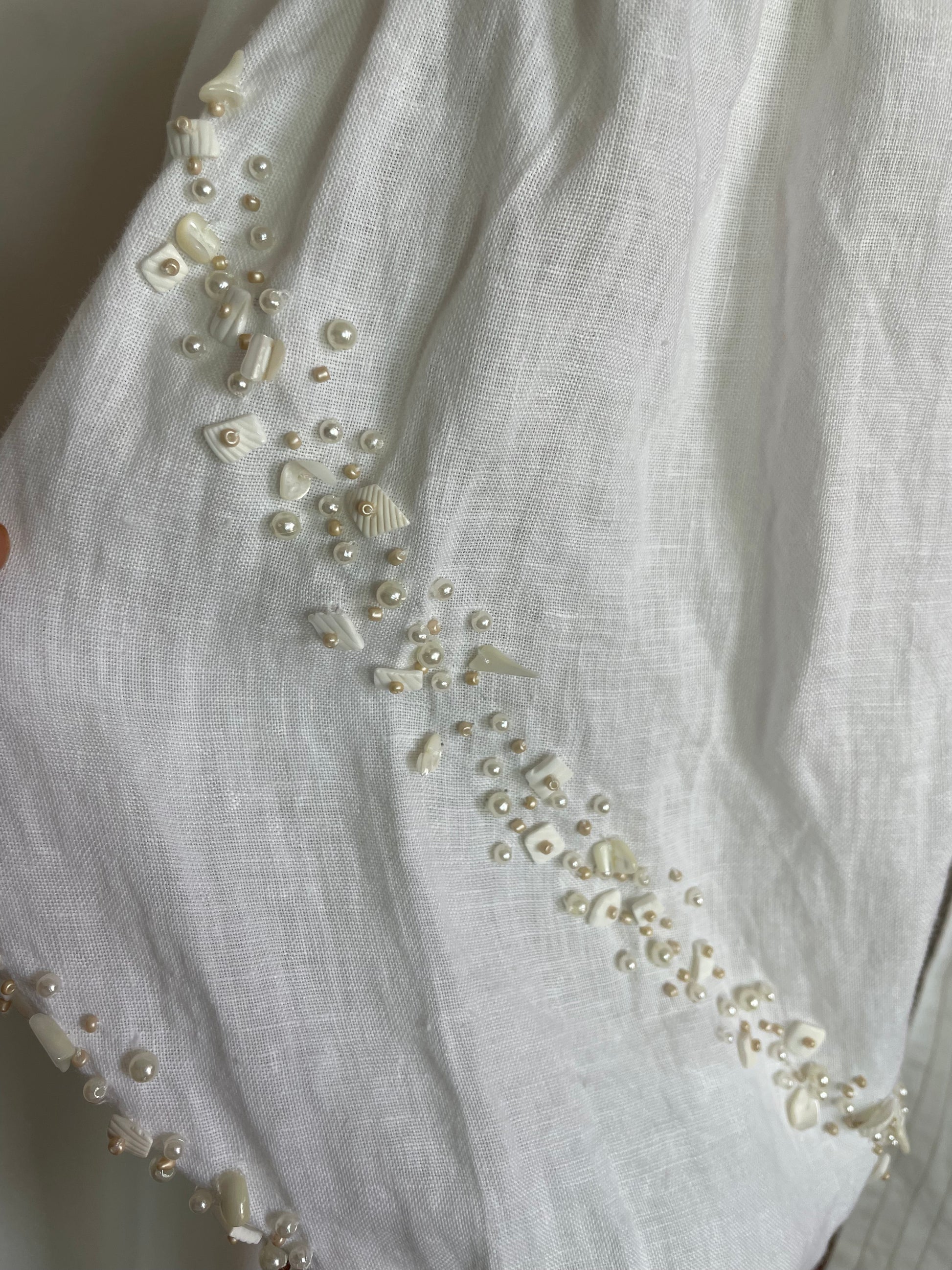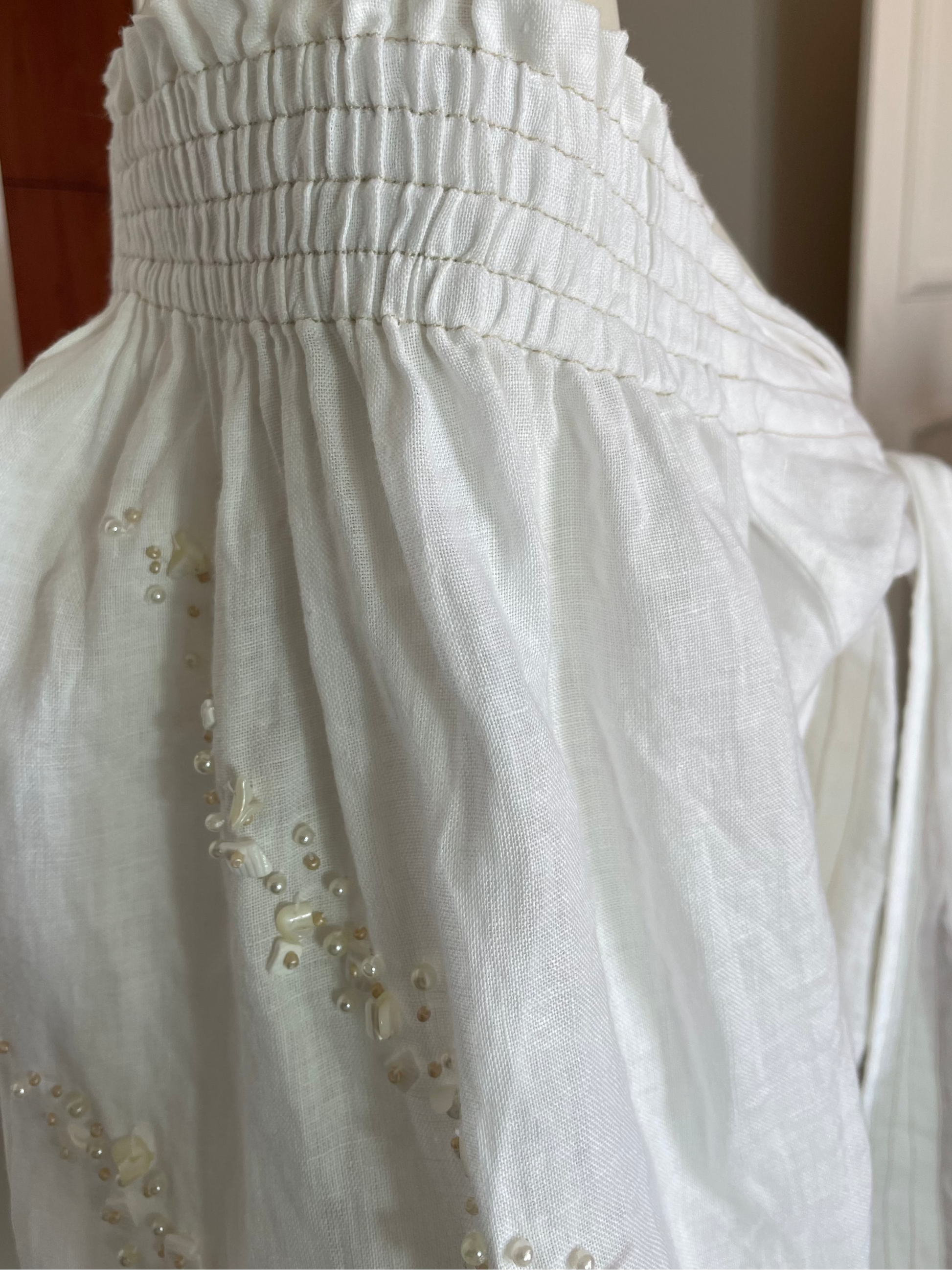Este croptop elaborado en lino destaca por su amarre multifuncional que permite múltiples estilos de uso. Cuenta con elásticos alrededor de los hombros para un ajuste cómodo y seguro. Sus mangas tipo globo incorporan detalles de piedras, añadiendo un toque sofisticado y distintivo a la prenda.