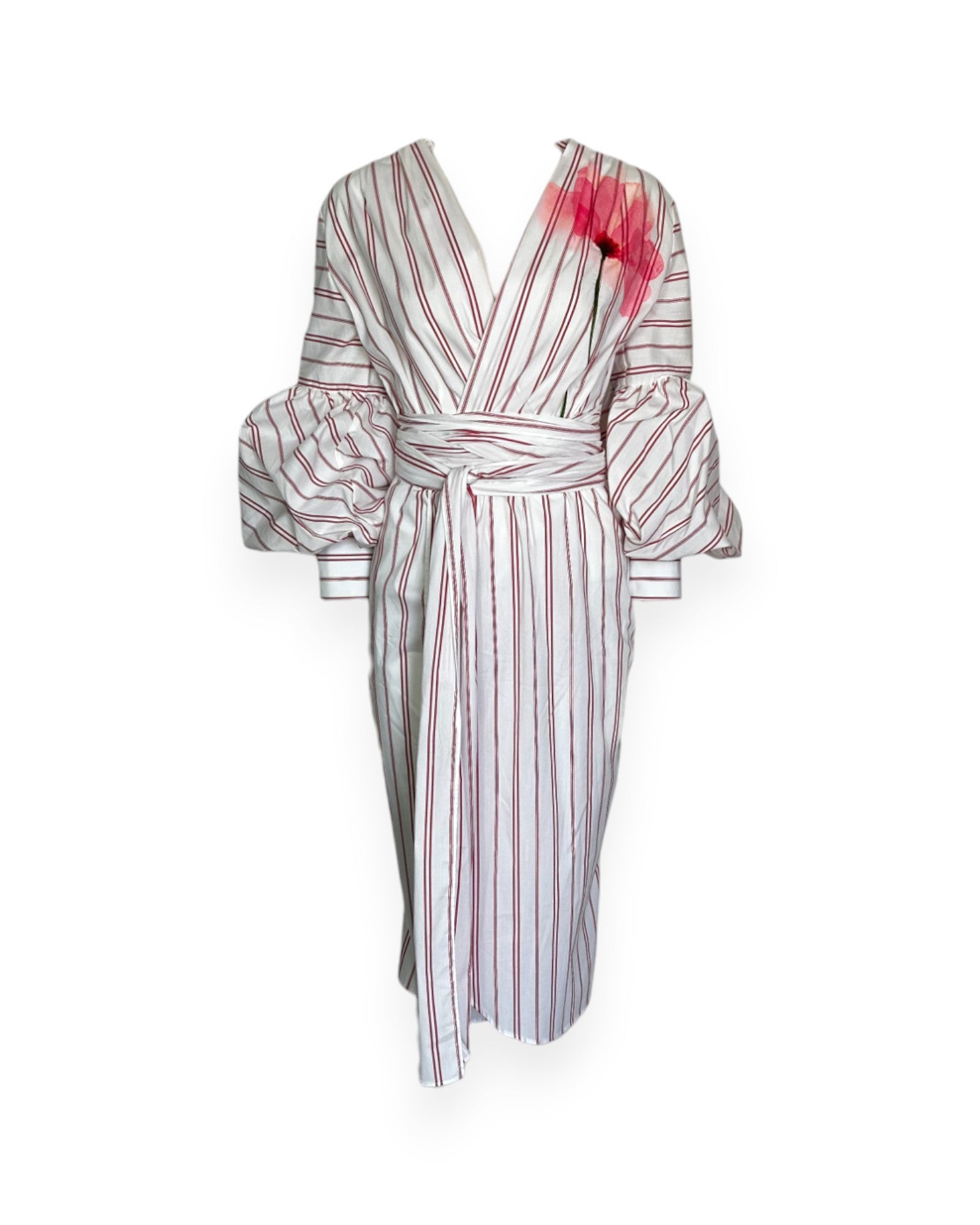 Este vestido midi tipo quimono cruzado ofrece un ajuste favorecedor gracias a su cinturón ajustable que realza la figura. Destaca por su elegante bordado en el lado izquierdo, que añade un toque sofisticado y único. Sus mangas largas con puños al final aportan un acabado refinado, ideal para lucir en cualquier ocasión con estilo y comodidad. Perfecto para quienes buscan combinar elegancia y comodidad en una sola prenda.