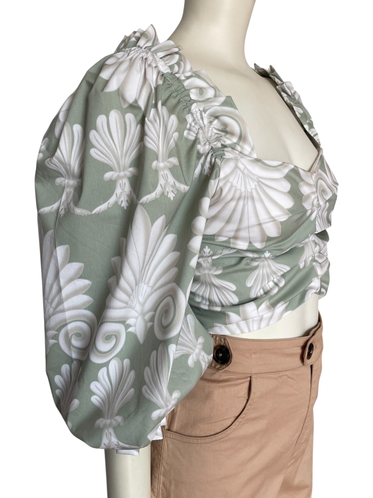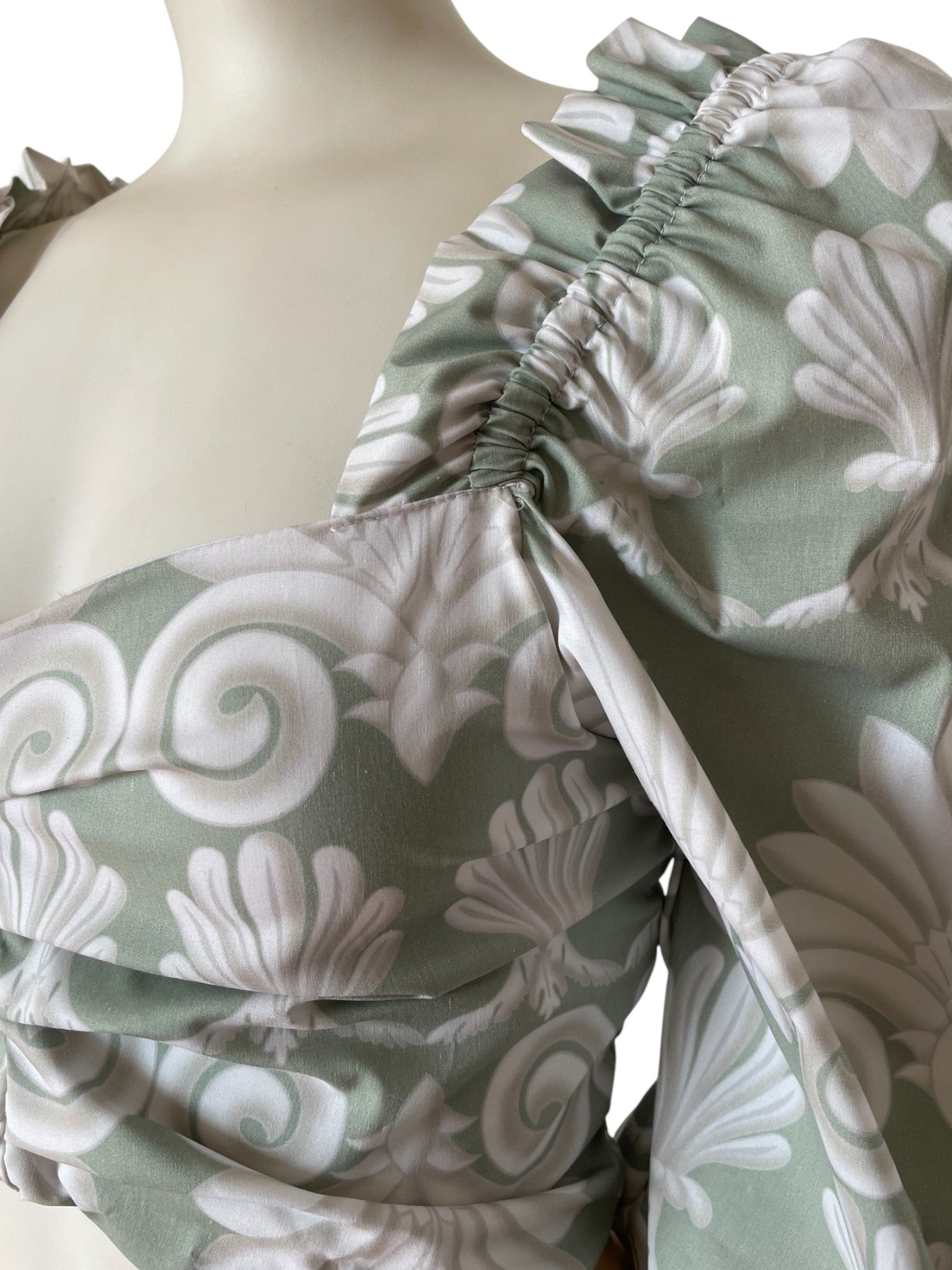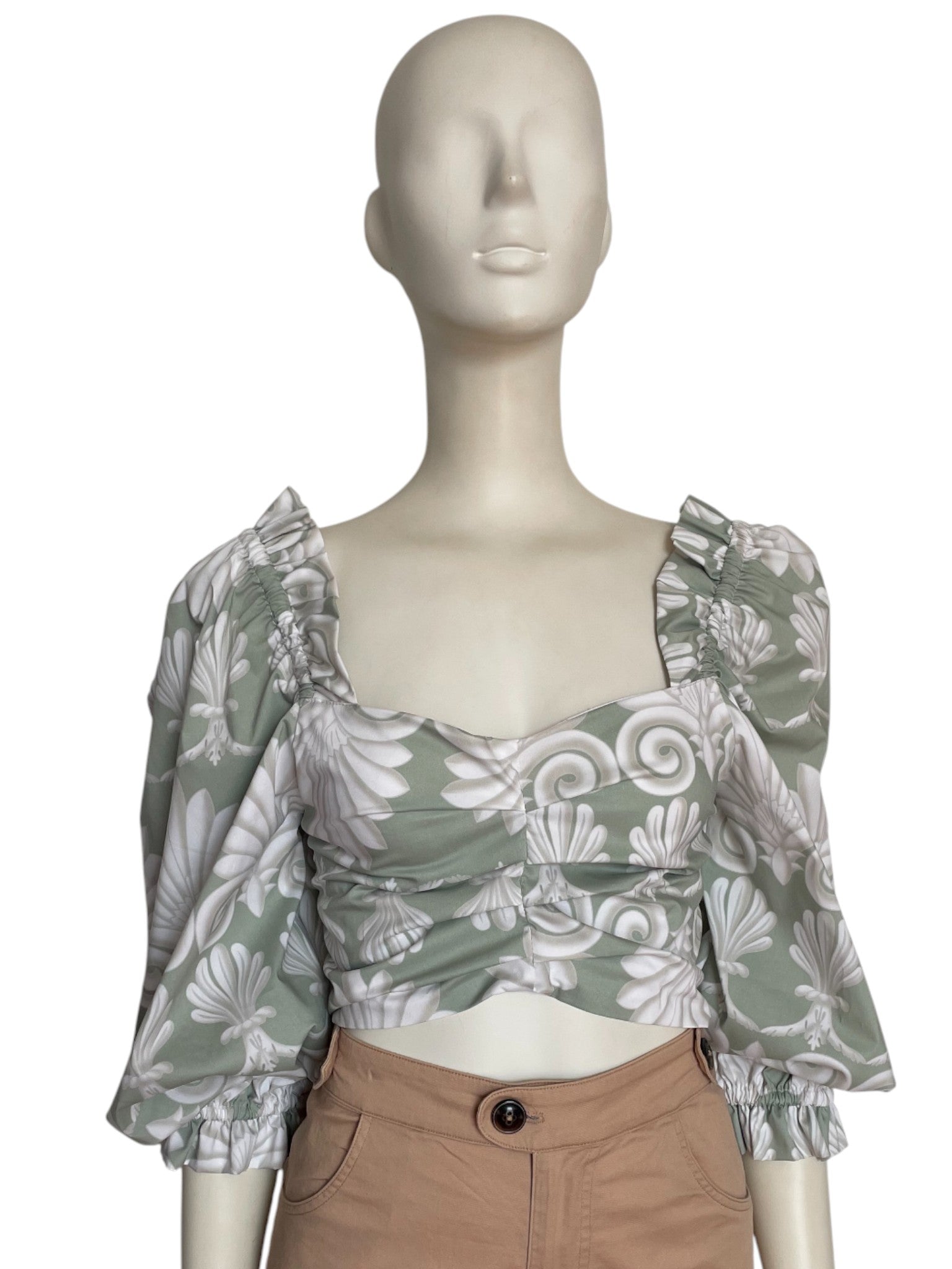 Este top Analu destaca por su elegante diseño de arabescos y detalle fruncido en el busto, que realza la figura con delicadeza. Cuenta con elástico en las mangas y en el respaldo, ofreciendo un ajuste cómodo y flexible que se adapta a tus movimientos.