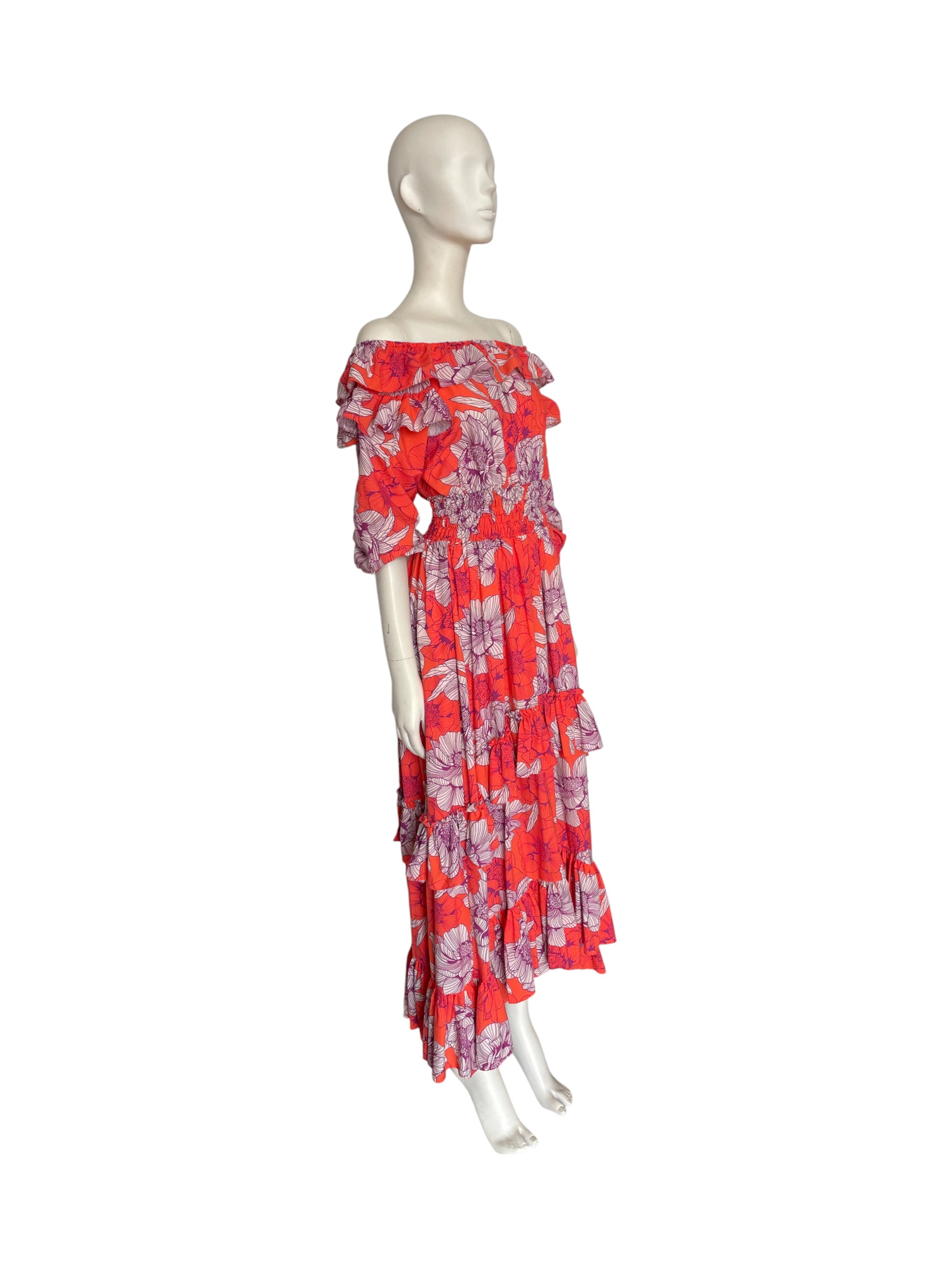 Este vestido midi con cuello bandeja y mangas 3/4 destaca por sus delicados detalles de boleros en los hombros y el ruedo, aportando un toque sofisticado y femenino.