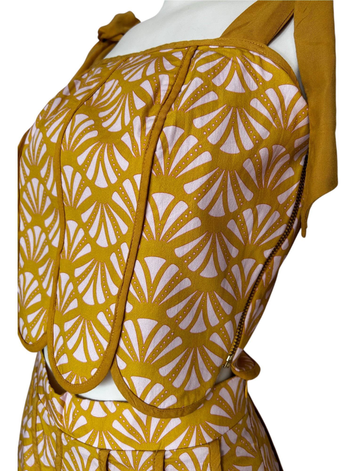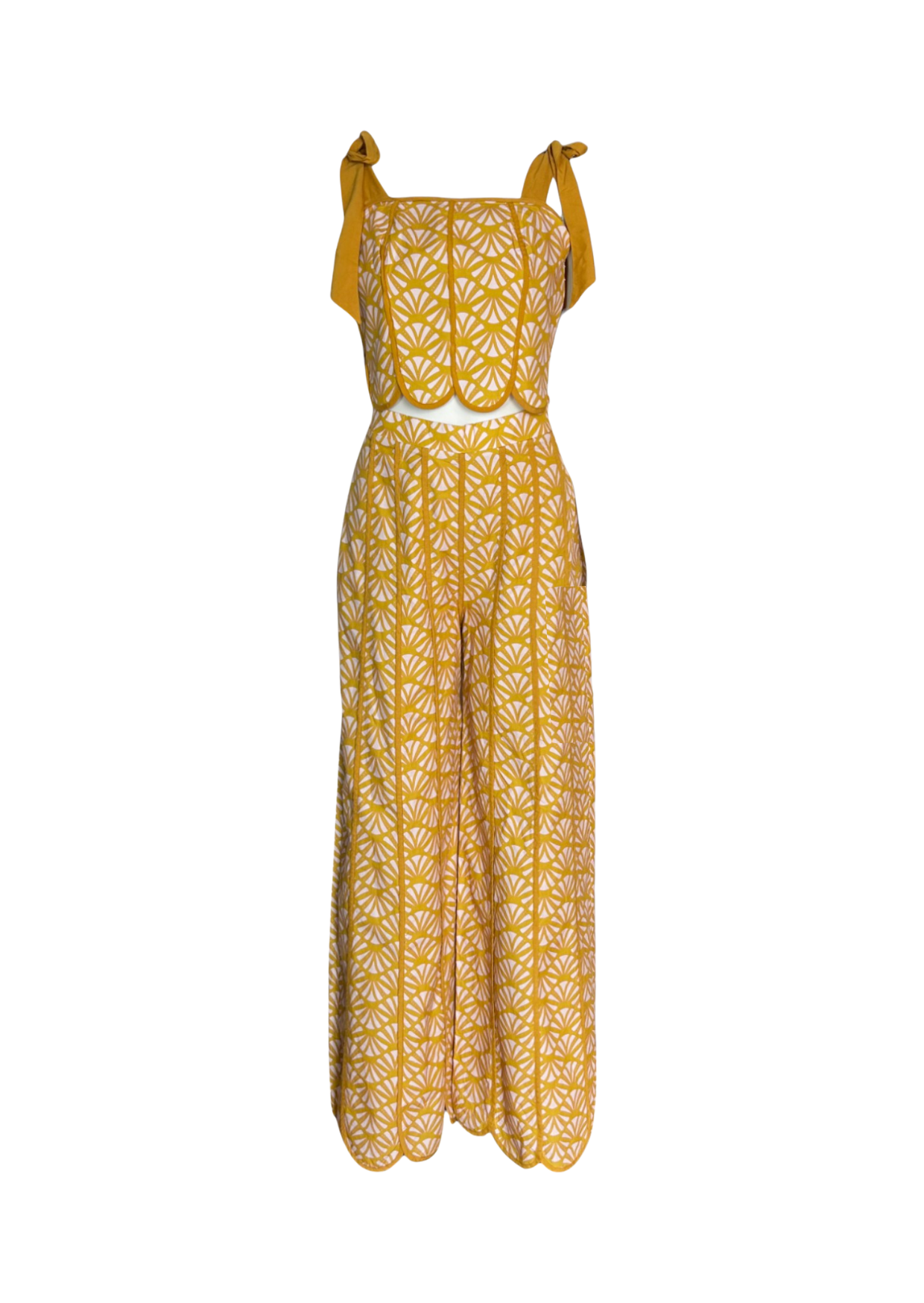 Este set combina elegancia y ajuste personalizado, con un top que presenta amarres ajustables en los hombros para un calce perfecto, además de delicadas ondulaciones en el ruedo que aportan movimiento y estilo. El pantalón de bota recta incorpora ondulaciones en las piernas que realzan la silueta, ofreciendo una apariencia moderna y sofisticada ideal para diversas ocasiones.